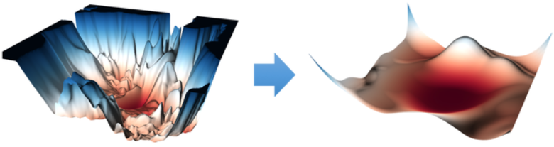 BN은 Loss function의 Lipschitzness를 impove하는데, 이는 Gradient가 stable하게 감소할수 있도록 만들어 준다. 즉 high learning rate에서도 stsable하게 learning하도록 만들어준다. 즉 soulution space를 아래와 같이 smoothing한다!