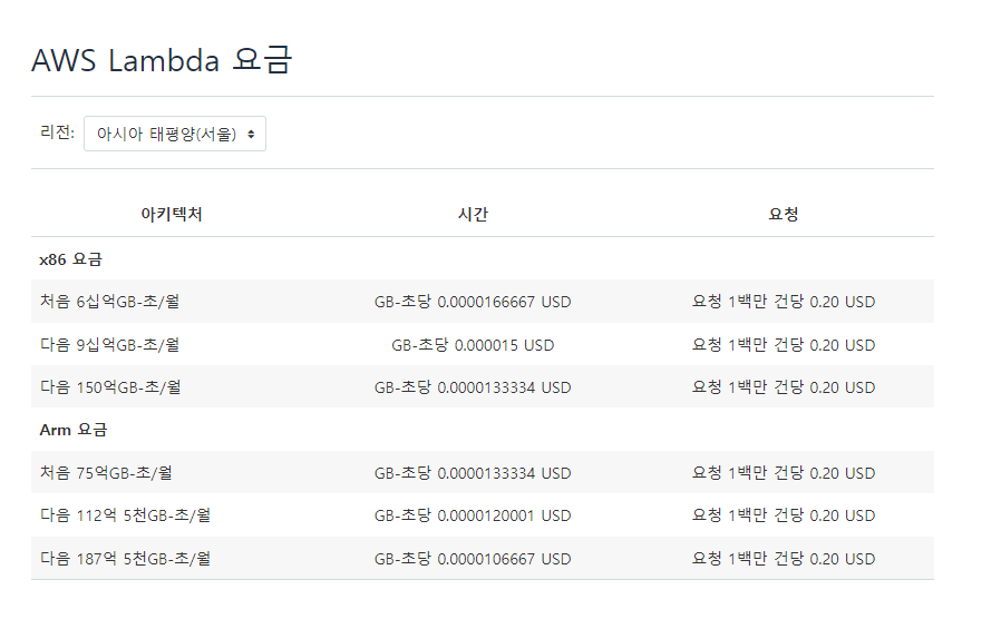 1GB 초 = 1,024 메모리에 1,000ms = 0.0000167 달러입니다.